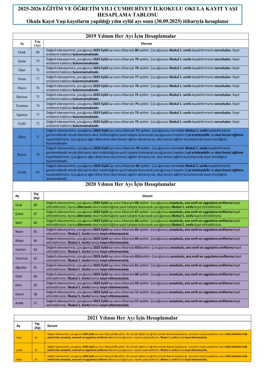 2025 - 2026 Eğitim-Öğretim yılında Anasınıfı ve 1. sınıfa kayıt olabilecek öğrencilerimizin doğdukları aylara göre çizelgesi aşağıda verilmiş olup kesin kayıtlarımız Bakanlığımızın e- kayıt verilerini açıklamasından sonra başlayacaktır.